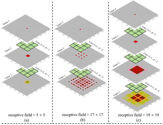 The size of the two-layer convolution kernel is 3 × 3, and the size of the receptive field after stacking the ordinary convolution with a step size of one is 5 × 5, as shown in Figure 3a. When the expansion rate is (3, 5), the size of the receptive field is 17 × 17. From Figure 3b, it can be found that there is a lack of correlation between the convolution results of this layer, resulting in the loss of local information and the gridding effect. To solve the problem, the Hybrid Dilated Convolution (HDC) [69] criterion is used to design the size of the expansion rate. We designed the expansion rate to be (1, 3, 5) and the perception size to be 19 × 19, as shown in Figure 3c, to avoid the gridding effect. In following equations, we assume that the convolution kernel size of the dilation convolution is k and the stride is one, then the size of the receptive field of the expansion convolution of the i + first layer is :