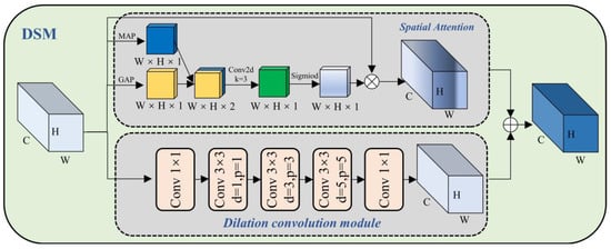 In steel surface defect detection, different types of defects often show different forms. For example, crazing defects often have a wavy texture shape, and inclusion defects often have irregular oval shapes. In addition to shapes, different types of defects have different sizes. Pitted-surface type defects are often large, while rolled-in scale type defects are often small. To better focus on the area of each different defect’s shape and size, as shown in Figure 5, we have proposed the Dilated Convolution and Spatial Attention Fusion Module (DSM). The module can better focus on the local area in the image, thereby improving the perception of local features, while increasing the receptive field.