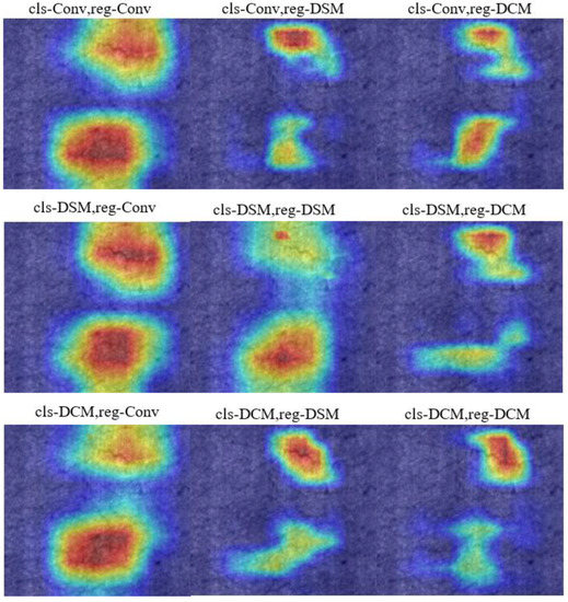 The heat map can visualize the prediction results of the model for each pixel, usually by means of color coding to represent the confidence of different pixels. Pixels with higher confidence are represented by warmer tones, such as red, and pixels with lower confidence are represented by cooler tones, such as blue. In addition, the heat map can also help us analyze the detection results of the model, such as judging which areas are easy to detect and which areas are easy to ignore. Figure 7 shows the heatmaps that visualize the fusion of DCM and DSM modules across different detection head tasks. When DSM is added to the regression head, the model can accurately locate the defect position. When the classification head adds the DCM module, the model can remove the redundant information of concern. In addition, using the DSM module can pay more attention to the spatial position of the target, and the DCM module can better remove redundant information. Through the visual analysis of the heat map of the model, it can be shown that DCM and DSM have the functions of accurately locating defect positions and removing redundant information.