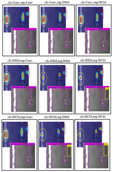 We have also performed heat map visualization analysis on images with both scratches and inclusion defects (Figure 8). The yellow ellipse in the image represents the region of interest of the large object heatmap, the black triangle represents the region of interest of the defect feature fuzzy object heatmap, and the red rectangle represents the region of interest of the heatmap containing the category. From the detection results, we can find that when one of the detection heads uses a common convolution structure, the model does not detect tiny defects. When DSM and DCM are used in combination, the model can more accurately identify the defect location and remove the redundant information of the defect. When the classification detection head uses DSM and the regression detection head uses DCM, the model pays more attention to small defects, while the degree of attention to other defects is more accurate and effective.