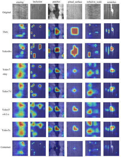 We have compared the proposed DAssd-Net model with other mainstream object detection models. These models include CenterNet [75], YOLOv5 [76], YOLOv5-v6.1 [77], YOLOv7 [29], and YOLOv8. The experiments are conducted using the same equipment and training strategy to compare the performance of steel surface defect detection in terms of accuracy and lightweight on the NEU-DET dataset. The heat map visualization results of different models are shown in Figure 10. Our proposed model can accurately identify the location of the target area with almost no redundant attention information. Other models do not pay enough attention to the center of the object.