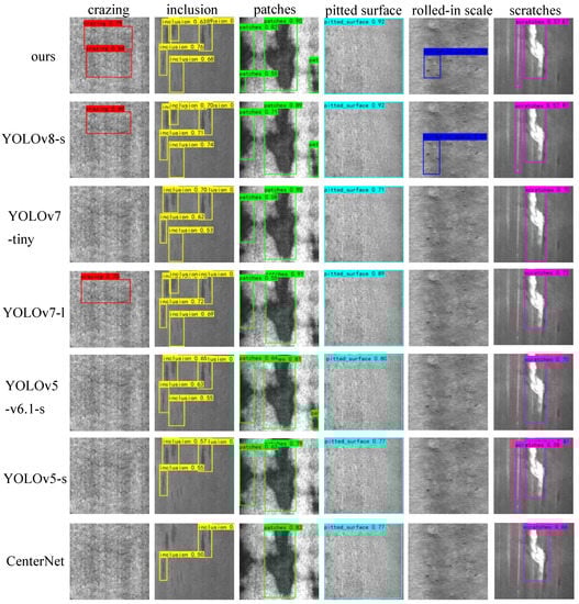 The final detection results are shown in Figure 11. We compare our proposed model with current mainstream object detection models. We can find that the two defects of crazing and rolled-in scale are not detected in most target detection models. The YOLOv8 model and YOLOv7 model only detect one target of the crazing defect category, while our proposed model can detect two defect locations. In small target defects, other models have missed detection, such as inclusion and patched defect categories, while our model can detect small target defects. The results show our proposed model can accurately identify the defect locations.