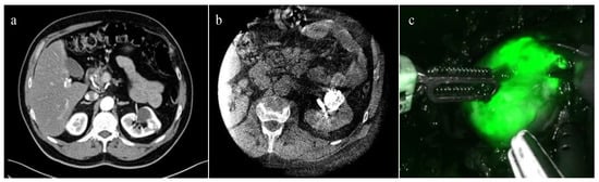 - Nardis, P.G.; Cipollari, S.; Lucatelli, P.; Basilico, F.; Rocco, B.; Corona, M.; Cannavale, A.; Leonardo, C.; Flammia, R.S.; Proietti, F.; et al. Cone-Beam CT-Guided Transarterial Tagging of Endophytic Renal Tumors with Indocyanine Green for Robot-Assisted Partial Nephrectomy. J. Vasc. Interv. Radiol. 2022, 33, 934–941. [Google Scholar] [CrossRef] [PubMed]