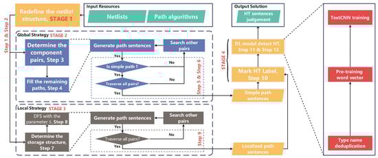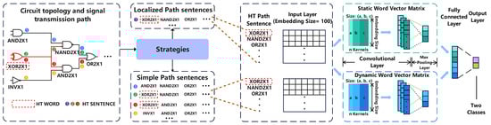 To solve the abstract problem raised above, this paper proposes the MHTtext model as shown in Figure 2. We redefine the netlist structure through the netlist code to extract the features of the components and wires. The contents of the netlist structure are divided into three categories and further reshaped in accordance with global/local-features-based algorithms. Furthermore, the algorithms generate specific sentences to fit two search patterns. To judge the extra HT path, the generated path sentences are labeled with HT and trained through word vector pretraining and TextCNN deep learning. The proposed architecture is the MHTtext model that can solve the above HT netlist detecting problem. The detailed step-by-step description is shown below: