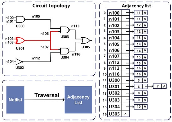 Consider a series of chip netlists ; there could be a set of HT components, which is implanted into the chips, and it is denoted by . When the HTs are not triggered in response, the HTs can coexist with the normal circuit and do not affect the function of the chip. Once the rare conditions or signals are released by the triggers, the payload is activated, and the paths containing HTs will perform abnormal behaviors, which cause damage such as signal tampering through signal transmission. p, m, k, v, and q mean the number of netlists, components, conditions, signals, and paths, respectively.