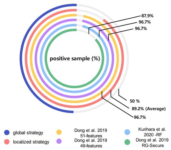 Comparison results for five ML indicators (Our - glo, Our - loc-opt, Our - loc-avg, Dong et al. 2019 - 49/51 features [], Kurihara et al. 2020 - RF [], Dong et al. 2019 RG-Secure []).