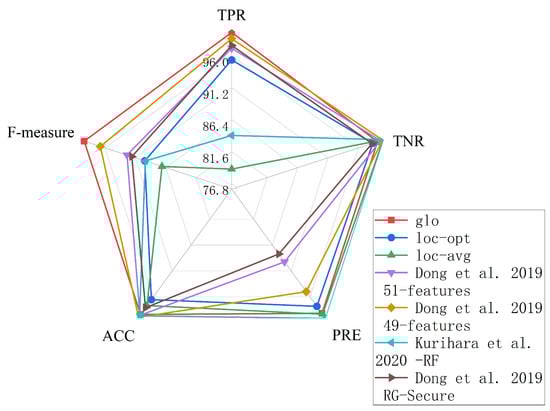 Figure 9 compares the performance of the centrally different methods on the machine learning indicators [,,]. The results showed that the proposed global strategy model was the best on the TPR and F-measures and ranked second on the PRE. Although both the TNR and ACC were only fourth, they were only about one percentage point behind the leaders, which can be considered at the same level. The results of all the average ML indicators were higher than 99%. The fact proves that the global strategy model is feasible. Moreover, the overall performance for the other methods had large fluctuations compared with this work, and the local strategy also achieved the desired results while controlling the time costs with .