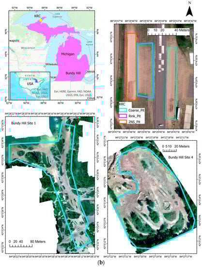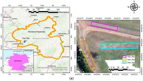 (a) Field site map for Trier WTD41 site, including soil pits. (b) Field sites in Michigan, USA (top right) KRC, (bottom left & bottom right) Bundy Hill (Sites 1 and 4, respectively).