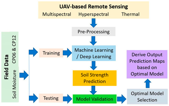 Future work will aim to better generalize the proposed models by adding more soil types with various moisture conditions. It is desirable to investigate the influence of organic content being present, which would also influence the soil strength and moisture content and play a role in shading. Scaling the proposed solution from a UAV-mounted one to satellite platforms is also important to see the potential for the scalability of the model and test the applicability of other remote sensing indices on these satellite platforms to help improve the predictions and calculate them over larger areas. A larger database of more soil types and field sites would allow one to explore more machine/deep learning algorithms and possible multi-level approaches to the models to pursue better predictive capabilities. Lastly, investigating how to convert this single-flight approach into a real-time implementation for instantaneous predictions in the field is also of interest.