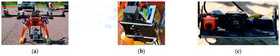 Project heavy-lift Bergen hexacopter drone mounted with various sensors. Micasense multispectral sensors (a), BaySpec hyperspectral sensor (b), and FLIR Vue Pro R thermal camera (c).