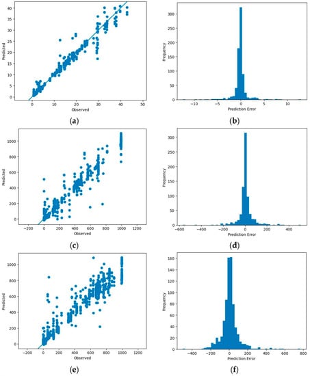 Optimal DL models using MLP (all predictors) for moisture content (a,b), CP06 (c,d), and CP12 (e,f) are shown comparing the predicted vs. true values and error histograms. Multi-picture format.