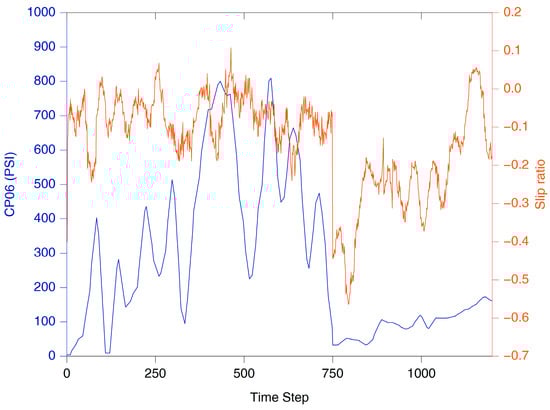 Moving Average (window size is a period of 25) plot for MRZR rear wheels showing the slip versus predicted CP06 from MLP model.