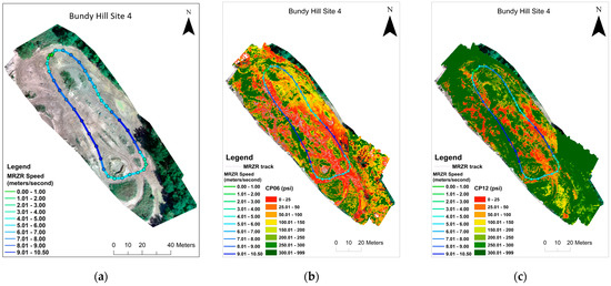 Map of Bundy Hill Site 4 showing the MRZR speed over the optical image (a), predicted CP06 (b), and CP12 (c) from the MLP models.