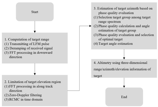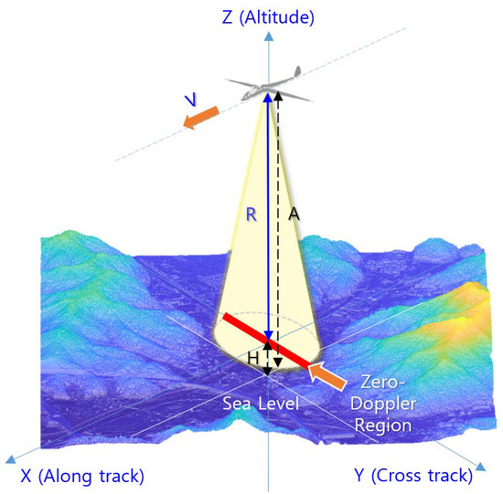Regarding the acquisition of the three-dimensional information of the target, the target range computation described earlier is important. In addition to the acquisition of the azimuth, which will be described later, it is necessary to acquire the angle (=elevation; in the three-dimensional (3D) radar, the angle is categorized as azimuth and elevation; since the elevation is used in the DEM to indicate the height, it is expressed as the angle (=elevation) for clarity) of the flight direction. In this paper, instead of acquiring the elevation of the target, the zero Doppler filtering of the delay/Doppler radar altimeter (DDA) technique [