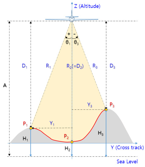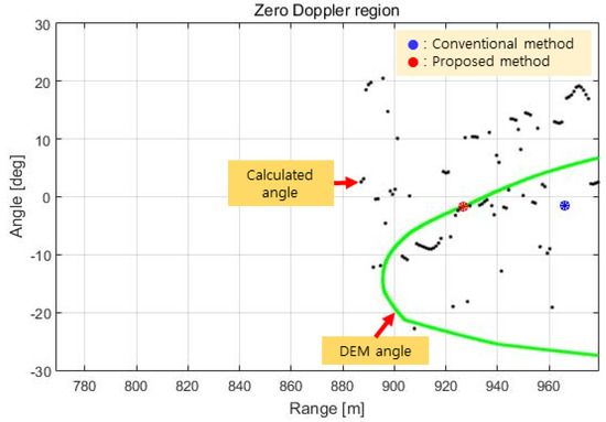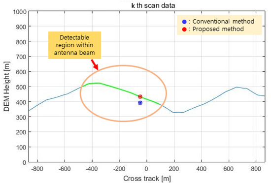 Figure 15. In this figure, the green line indicates the height of the DEM of the detectable region within the antenna beam width of the IRA, the blue dot is the height of the terrain computed by the conventional method, and the red dot is the height of the terrain computed by the proposed method.