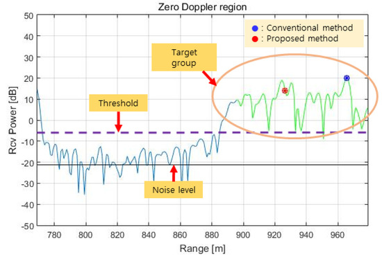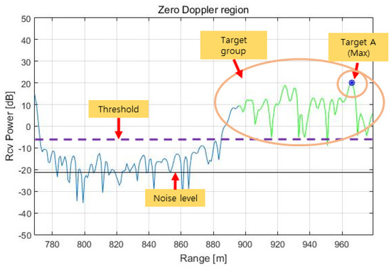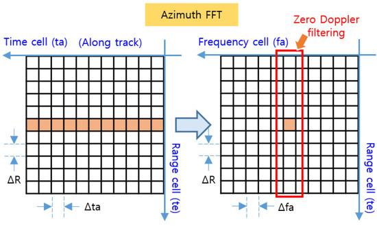23]. It is performed only until the azimuth FFT; then, only the frequency signals in the zero Doppler region shown in