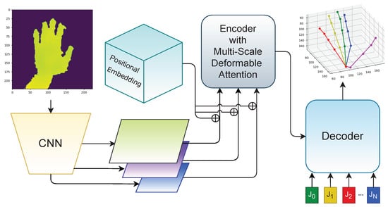 Most of these works depend on input data that contain correctly detected images hand cropped from the full-scene image. Early works use simple depth map thresholding as a rough detection center of mass and a bounding box defined around them. Otherwise, most other works adapt the hand localization network proposed in [] (V2V-PoseNet). Only a few works deal with hand pose estimation from the full-scene image as one complex problem [,,]. In [], the authors propose the 2D object detection method via three neural network models, and similarly to [,], localization networks are used in one pipeline solution. Following this research, we propose a new transformer architecture that can also be innovatively tailored for full-scene images as one model solution.