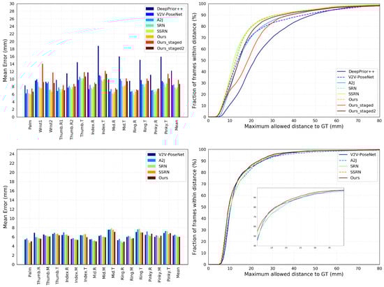 Comparison with state-of-the-art methods on NYU (upper line) and ICVL (lower line) datasets. Ours—DePOTR; Ours_staged—MuTr S3 enhance2; Ours_staged2—MuTr S3 enhance2 with the “cube trick”.