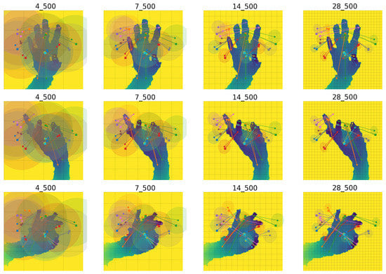 Figure 5 depicts DePOTR cross-attention for different feature level sizes. Similarly, as in the original Deformable DETR, we expected that to correctly predict joint positions the model will look at the surroundings of the joint itself, i.e., cross-attention will correspond to the part of the image with the predicted joint. However, closer analysis revealed that this is not true for our model. Rather, DePOTR spreads its cross-attention over the parts of the image where it is probable it will find some hand parts. The model will find these interesting image parts during its training and subsequently predict the results from the surroundings of these learned positions—anchors. We observe small movements of anchors for different hand shapes and different hand positions. In other words, for example, if the same image will be augmented to move the hand left, all anchors will move left as well; however, their relative position is almost static. In our opinion, this counter-intuitive behavior is the result of the task change (object detection for the original DETR vs. pose estimation for DePOTR) and the positions of the anchors are dependent on the training set. This phenomenon definitely needs additional research and we are planning to focus on it in the future.