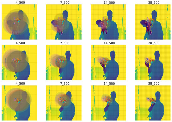 Examples of distribution of all DePOTR cross-attention points (500) for all 14 joints and for three different random test images; from the left to the right feature level sizes: 4, 7, 14 and 28. The same color cross point denotes the reference point, the bold point is the mean and the circle is the variance of all offset sampling points for one joint.