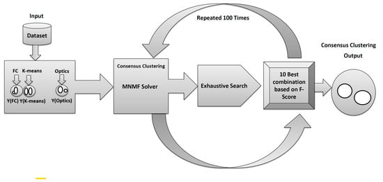 | Input: Dataset A={a1,…., an}, a set of partitions B of data points B = {b1,b2, ….., bt} such that each partition B consists of a set of clustering Dt= {d1t, d2t, …., dkt} that uses a selected clustering methodology. Output: The set H of B heterogeneous clusterings that included the 10 best and highest F-scores (or performance metrics α) and appeared in all 100 runs when using the exhaustive search method. Initialization: Calculate the X-cluster= {The results of each clustering Initialize H= {}. Define the connectivity matric CM as follows: Define a matrix Nixk such that in each row only “1” can exist and the rest of the values should be zeros. Calculate the NNT. If i belongs to k, the results will equal 1, otherwise they will equal zero. Define L as L = NTN. Begin , where NTN=1 Step 5: The exhaustive method finds the best performance metric from among the top 10 recorded combinations. Step 4: Steps 1-4 are repeated 100 times. Step 6: The final consensus clustering solution assigns each data point in the input data set to a consensus cluster. Step 7: The algorithm returns H and performance metrics α (including F-score, accuracy, precision, and recall) End |