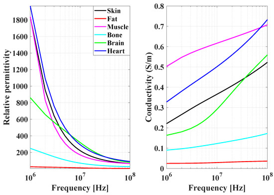 Figure 2 displays the dielectric properties of various human body tissues, including relative dielectric constant and conductivity, from 1 to 100 MHz, calculated using the Cole–Cole formula [22]. Notably, the relative permittivity of these tissues is exceptionally high, particularly below 10 MHz, indicating their strong ability to receive an electric field in this frequency range. When an electrode source is in contact with the body, the output electric field can generate surface waves that attach to the body’s surface [23]. As a result, the body and the source form a larger radiation source whose electromagnetic fields in the radiating far-field region can be ignored at frequencies of 1 to 10 MHz, as the body and electrodes are much smaller than the wavelength. Therefore, the electromagnetic fields emitted by the system, composed of electrodes and the human body, are limited to the near-field region [16].