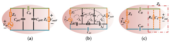 Assuming that the relative area and distance between the earth ground and the ground of the transceiver are equal, can be used. In addition, as and are both less than 10 pF [13], the values of and are greater than 10 kΩ. However, = 50 Ω, the value of is ∼10 Ω [13]. As a consequence, Equation (6) can be further derived as Equation (7).