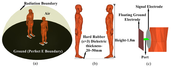 The finite element simulation setup for the NF-IBCC system: (a) the overall view of the finite element model. (b) A human body model with a height of 1.8 m has a rubber layer with a thickness ranging from 20 to 50 mm between its feet and the earth ground. (c) The electrode structure is mainly composed of a signal electrode, ground electrode, and port.