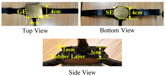 The transmitting end is set to sweep frequencies in the range of 1 to 10 MHz, with an output power of 0 dBm, which is well below the safety limit set by ICNIRP [15]. The electrode (as shown in Figure 6) consists of a signal electrode (SE), which has a thickness of 1 mm and a radius of 2 cm, a ground electrode (GE), which has a thickness of 1 mm and an area of 4 cm × 4 cm, and a rubber layer (3 cm thickness) located between the SE and GE to isolate them and prevent short circuits. The electrode is fixed on the wrist using a watchband, with the SE in contact with the skin and the GE suspended in the air.