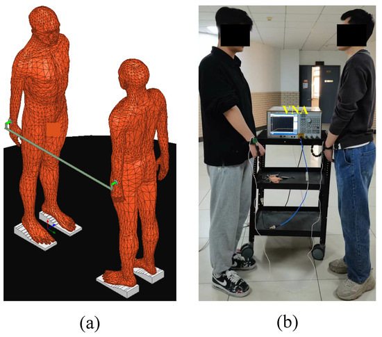 In Figure 7b, a VNA is employed to measure the gain. Although the transmitter ground and the receiver ground of the VNA are shorted, wires are connected between the two ground electrodes to further eliminate any impact of the return path. The two bodies have similar physical characteristics in terms of height and weight, both measuring approximately 1.80 m and weighing around 80 kg.