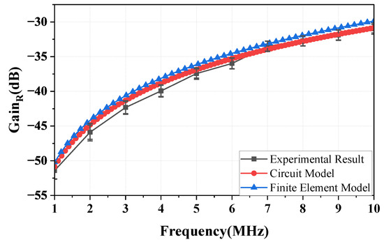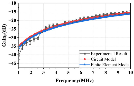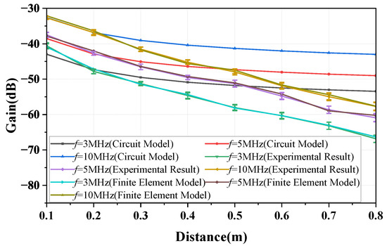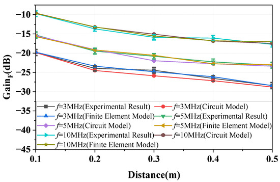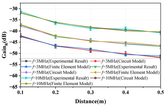 Figure 14 depicts the variation of the gain of the return path with distance d at frequencies of 3, 5, and 10 MHz. As shown in the figure, the gain decreases as the distance increases, and this behavior is consistent with both the experimental and finite element simulation results, as well as the analytical results derived from Equations (12) and (13). In addition, the results show that the variation in the measured gain over multiple days is within 2.6 dB.