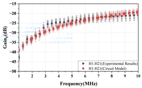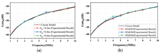 Furthermore, the gain of the NF-IBCC system depends on the series-equivalent capacitance of the coupling capacitances and . The influence of the coupling capacitance with the smaller value has a more significant effect on the gain. Comparing Equations (4) and (13), it can be seen that the value of is much larger than . This indicates that the gain of the NF-IBCC system is more dependent on the core parameter , further supporting the perspective that the channel characteristics of NF-IBCC cannot be accurately measured using common ground instruments.