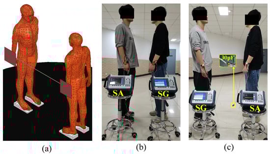 The NF-IBCC system is equivalent to a circuit model composed of lumped parameters; its accuracy was verified in our previous work, as shown in Figure 3b [13]. It consists of the forward coupling path, return-coupling path 1, and return-coupling path 2. The electric field coupling between the two bodies is defined as the forward coupling path and is represented by the lumped parameter . The electric field coupling between transceiver grounds is defined as the return-coupling path 1 and is represented by the lumped parameter . The electric field coupling between the transceiver ground and the earth ground is represented by the lumped parameters and . The electric field coupling between the foot of the bodies and the earth ground is indicated by the lumped parameters and . The lumped parameter represents the loss impedance of the earth ground. , , , , and represent the return-coupling path 2. In addition, and represent the skin–electrode contact impedances. The source is composed of and . is the impedance of the source. represents the load impedance at the receiving end.