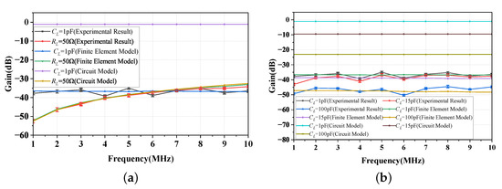 The analysis results from Section 2.3 indicate that the load impedance can significantly affect the passband characteristics of the gain of the NF-IBCC system. Specifically, a load impedance of = 50 Ω will produce high-pass characteristics, while a load impedance of will result in flat-band characteristics. To confirm these findings, finite element simulations and experimental methods are employed in this subsection.