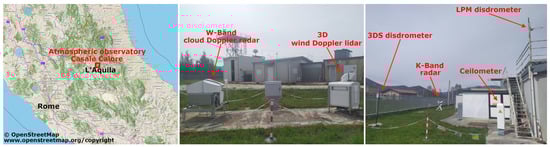 The Casale Calore observatory is located near L’Aquila, Italy (42.383081 N, 13.314806 E, 683 m ASL) surrounded by the Appenine range (see Figure 1). Casale Calore is the atmospheric observatory of the University of L’Aquila, hosted by the Department of Physical and Chemical Sciences and managed by the Center of Excellence Telesensing of Environment and Model Prediction of Severe Events. The observatory is situated in a valley with a temperate climate with warm summers and without a dry season (Köppen–Geiger-type Cfb) [80]. The annual mean temperature is 12.8 C (minimum temperature 5.9 C, maximum 19.6 C), and the annual precipitation is 620 mm distributed over 85 rainy days, with autumn being the rainiest season. The circulation in the valley is dominated by the mountain–valley breeze system, with anabatic up-valley (to the NW) during the daytime and katabatic down-valley (to the SE) during the night time [81]. The observatory hosts several instruments and routine activities to collect long records of ozone, pressure, temperature and water vapour. Recent funding opportunities have allowed to the site deploy new instruments, thus extending the observation capabilities to clear sky winds as well as cloud and precipitation profiles. Thanks to these updates, a field campaign, named CORE-LAQ, was set up and officially started on 13 December 2022 and expected to end in the summer 2023, thanks to a fruitful collaboration between CETEMPS and CNR-ISAC. CORE-LAQ focuses on cloud and precipitation observations made possible by simultaneous acquisition W- and K-band vertically pointing radars and disdrometers positioned close to the radars (Figure 1). The main goal of CORE-LAQ is to investigate the use of dual-frequency radar in the K- and W-band to retrieve cloud and precipitation microphysics. Such an investigation is quite unique and it is the first of its kind in Italy. After the conclusion of the campaign, the raw data acquired will be made freely available on a public repository.