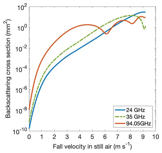 Simulated backscattering cross-sections at the K- (24 GHz), Ka- (35 GHz) and W-band (94.05 GHz) as a function of the fall velocity of water drops in still air at the sea level, 20 C temperature, 10 drop canting angle using the Beard and Chuang drop size-shape model [86].