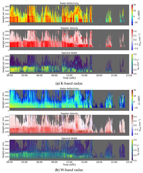 Doppler spectra allow for the calculation of the mean Doppler velocity (), obtained as the reflectivity-weighted terminal velocity of hydrometeors: