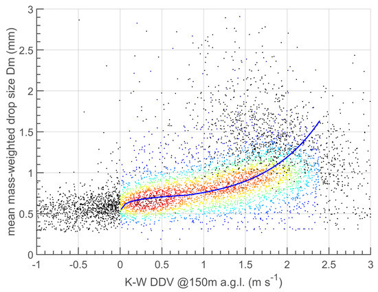 Density scatter plots for the K–W DDV vs. from the LPM disdrometer during the CORE-LAQ field campaign. Points are coloured based on data density ranging from dark red (high density) to dark blue (low density), whereas the black dots represents the filtered out data. The blue line is the regression curve (Equation (8) in the main text).