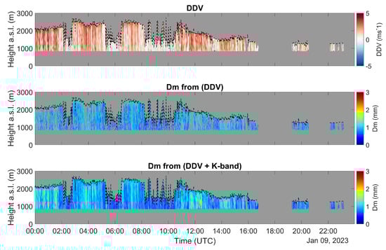 Time–height time series for the 9 January 2023 event of DDV (top); derived from DDV using Equation (8) (middle); and using a combination of DDV and from the K-band radar (Equations (8) and (9)) (bottom). The data shown refer to a rain regime only (i.e., areas below the melting layer altitude).