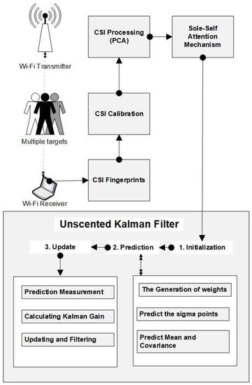 The architecture of the proposed system is illustrated in Figure 1 above. Firstly, the CSI fingerprint data is collected from the commodity device’s Wi-Fi network, the transmitter, and the receiver. The raw CSI data will go through the calibration process and then into the principal component analysis (PCA) method to decrease the dimensionality of large data. The proceeds will then be fed into the sole self-attention mechanism model, which estimates the target’s present location with regression. After that, the proposed deep learning model will pass its results to the unscented Kalman filter, updating the location using the previous location and the target’s current location. For accurate trajectories of the destination, mapping and pairings are applied to the filter. A detailed description of the model is discussed below.