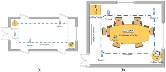 The CSI data we collected while tracking the 20 participants was 17,600 = (10 min × 60 s/min × 20 Hz), with 880 for each participant. The collected samples were acquired from a controlled environment set up as shown in Figure 2a,b below, using only two devices: the laptop as an RX and the access point as TX. Participants were randomly asked to walk around the room, not following a specific path. While walking, a person has a unique reflection and influence on the radio signal. Several studies have indicated a reduced obstruction when the radio signal propagates freely in open spaces. Hence, we placed the RX and TX 1 m above the ground level to overcome this obstruction drawback. We collected the sample data in the dormitory four-floor 12 hallway and the School of Computing conference room at the University of Science Technology, Beijing. The participants walked different distances in meters from the entrance through the predefined five routes, both in the hallway and conference room.