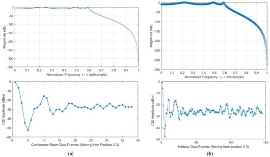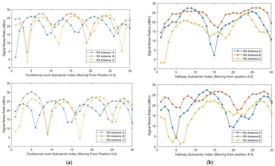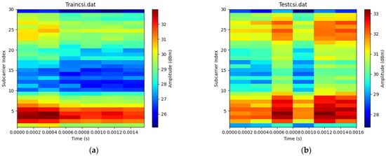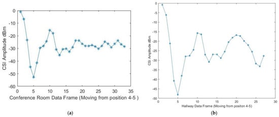 Figure 4a,b below serve as illustrations of the variations in signal amplitude resulting from the target’s movement in the testbeds. These figures visually demonstrate the unique amplitude patterns observed at different positions. The analysis of these figures underscores the importance of leveraging CSI signals, as indicated by the conclusion drawn regarding the favorable results achieved through matching specific CSI parameters. These figures visually demonstrate the changes in signal amplitude as the target moves within the conference room and dormitory hallway testbed. Each position within the testbeds exhibits a distinct amplitude pattern that corresponds to the target’s distance from the transmitter and receiver. The focus here is on the utilization of CSI signals to optimize signal processing techniques and enhance overall system performance. Channel state information comprises time stamps, which enfold every 4300 s (or 72 min), the beamforming count registered by the drives, and the transmitter-receiver information. Additionally, the Channel State Information (CSI) includes not only RSSI but also permuted signals from the three receive antennas, packet rates, and the 3D matrix of the OFDM subcarriers. These elements, as illustrated in the figures provided, form the comprehensive CSI dataset, enabling more accurate analysis of the wireless channel’s characteristics and behavior.