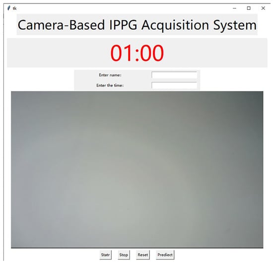 In order to achieve better face video recording and signal acquisition, this project has developed a camera-based IPPG signal acquisition system, which is capable of capturing the images captured by the camera and displaying them to the system interface synchronously to facilitate the adjustment of the pose during recording and adding a timer recording function to meet the needs of different video recording durations with convenient operation. The interface of this acquisition system is shown in Figure 2. The specific process of face video capture includes the following steps:
