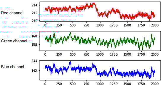 where is the number of frame sequences, and and are the width and height of the region of interest. These videos are decomposed into frame pictures, and then the three components of RGB channels of each frame are extracted from the videos. Obtain the signal amplitude by calculating the pixel average. Finally, the three-channel IPPG signal is obtained by Equation (3), as shown in Figure 4. Curves of different colors represent signals extracted from different channels. The optical absorption property of hemoglobin reaches its maximum when the wavelength of light is in the range of 500 nm–600 nm, which corresponds to the green channel signal []. Meanwhile, the green channel signal has the least noise interference, so all subsequent studies extracted the IPPG signal by the green channel signal.