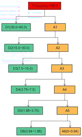 In this paper, the IPPG signal is taken as an example to perform six-scale wavelet decomposition, and the frequency ranges of each scale decomposition are shown in Figure 5. The approximation coefficients of each layer in the figure are used to represent, and the detail coefficients are used to represent, and the study shows that the baseline drift phenomenon occurs in the low-frequency region, concentrated in, and on. When recording the video, the frame rate of the camera is set to 60 FPS, while the breathing frequency is between 0.2 and 0.8 Hz, which corresponds to the sixth layer of wavelet decomposition. Therefore, Sym6 was selected as the wavelet basis function for the experiment, and the signal was decomposed into six layers, where the low-frequency component in the sixth layer was considered as the baseline drift signal. The sixth layer low-frequency component of the wavelet signal is subtracted from the original signal to achieve the removal of the baseline drift.