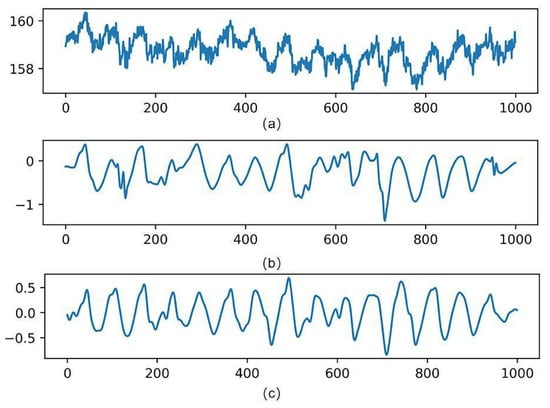 Studies have shown that the frequency range of the pulse wave is 0.7 Hz–6 Hz []. For the high-frequency noise caused by the circuit devices, the experiments were filtered using a fourth-order bidirectional Butterworth (Butterworth) low-pass filter with a cutoff frequency of 8 Hz and then a fourth-order bidirectional Butterworth high-pass filter to remove the low-frequency noise with a cutoff frequency of 0.6 Hz. The most significant specific of the Butterworth filter is the frequency response curve in the passband flat, which can make the filtered waveform smoother and retain the useful information in the IPPG signal to the maximum extent. By the above operation, the denoising of the IPPG signal is experimentally achieved. Figure 6 shows the process of the original IPPG signal processing.