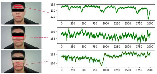 The experiments were conducted by selecting 8 face videos of the subjects, extracting IPPG signals from three different ROI regions, drawing the mean green channel grayscale curves of different regions, and finding the most suitable ROI region through comparison experiments. The video recording duration is 60 s, the resolution is 1920 × 1080, the frame rate is 60 FPS, the natural light irradiation conditions are carried out, and the experimental subject is required to be in a calm state when recording. The pulse wave signals were extracted from three parts of the forehead, nose and cheeks, and mouth, respectively, for comparison experiments. Figure 7 shows the comparative experimental results of one of the experimenters.