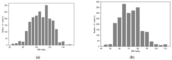 During the face video recording, the volunteers were asked to keep their heads as stable as possible and not to wear accessories that would obscure the facial region of interest to ensure that the pulse wave signals could be extracted correctly. The study also used a commercial sphygmomanometer, the Yuyue YE670A (which meets ESH as well as AAMI standards) to measure blood pressure and heart rate simultaneously and record them, with the signal pre-processing process as described previously. Finally, by collecting data from 115 volunteers, we constructed and open-sourced the first dataset for imaging-based photovolumetric pulse wave signals and simultaneous blood pressure—IPPG-BP (https://github.com/czh846567921/IPPG-BP/tree/main, accessed on 28 February 2023). The dataset contains 2120 pulse wave segments and their corresponding blood pressure data. To facilitate model training, the study classifies the blood pressure data into one category for every 5 mmHg, and the histogram of the blood pressure data distribution is shown in Figure 9. The study randomly selected data from 81 of 115 volunteers as the training set, while the data from the remaining 34 volunteers, which is now open, was used as the test set. The overall distribution of the data is shown in Table 1.