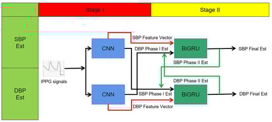 The block diagram of the multi-stage model is shown in Figure 10. The upper branch is used to estimate the systolic blood pressure, while the lower branch with used to estimate the diastolic blood pressure. Each trajectory consists of a two-stage deep neural network. Assigning two independent trajectories allows the network structure to extract features and cross-apply them to finally achieve blood pressure measurement.