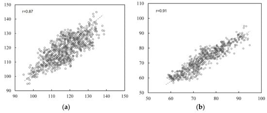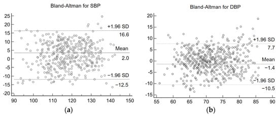 This section analyzes the prediction results of the multi-stage model through regression curves and Bland–Altman analysis plots. A scatter plot of the estimated blood pressure and the reference blood pressure is shown in Figure 13. From the figure, it can be concluded that for SBP, the correlation coefficient between the estimated blood pressure and the reference value is 0.87, and the data are evenly distributed. For DBP, the correlation coefficient between the estimated blood pressure and the reference value was 0.91, with concentrated data distribution. The scatter plot results indicate that the multi-stage model can achieve accurate blood pressure prediction.